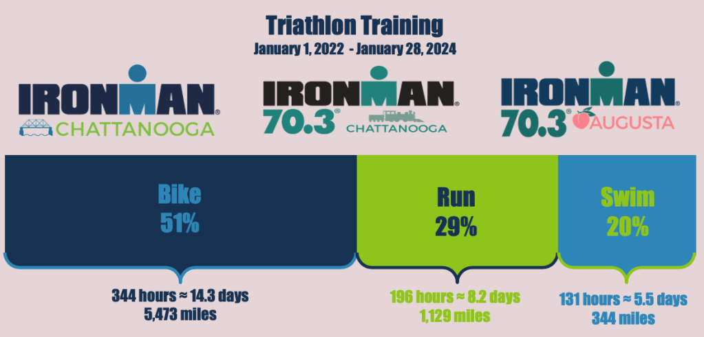 Almost 30 percent of my time has been spent pounding the pavement (read: running). In addition to the races I highlighted above, I also raced the 2023 IRONMAN Chattanooga as a relay with a friend. I did the swim (2.4 miles) and the run (a marathon), while my friend conquered the bike leg. Fun fact, the IRONMAN Chattanooga race course is 116 miles instead of 112 because of logistics getting into and out of the city. Bonus miles – because 112 isn’t enough (sarcasm, my friends).