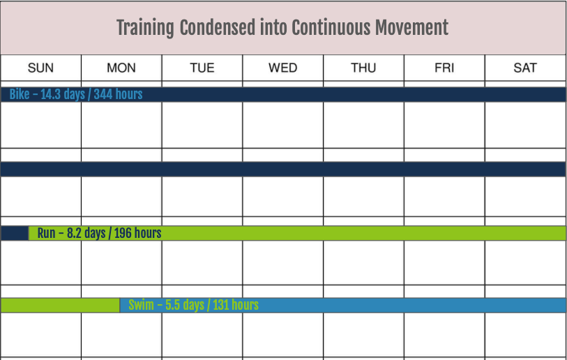 The hourly breakdown for each discipline above is translated into non-stop 24-hour days and the corresponding total mileage. We can really only see the relative duration of training across swim, bike, and run in this view. So just how long is 344 hours of cycling?